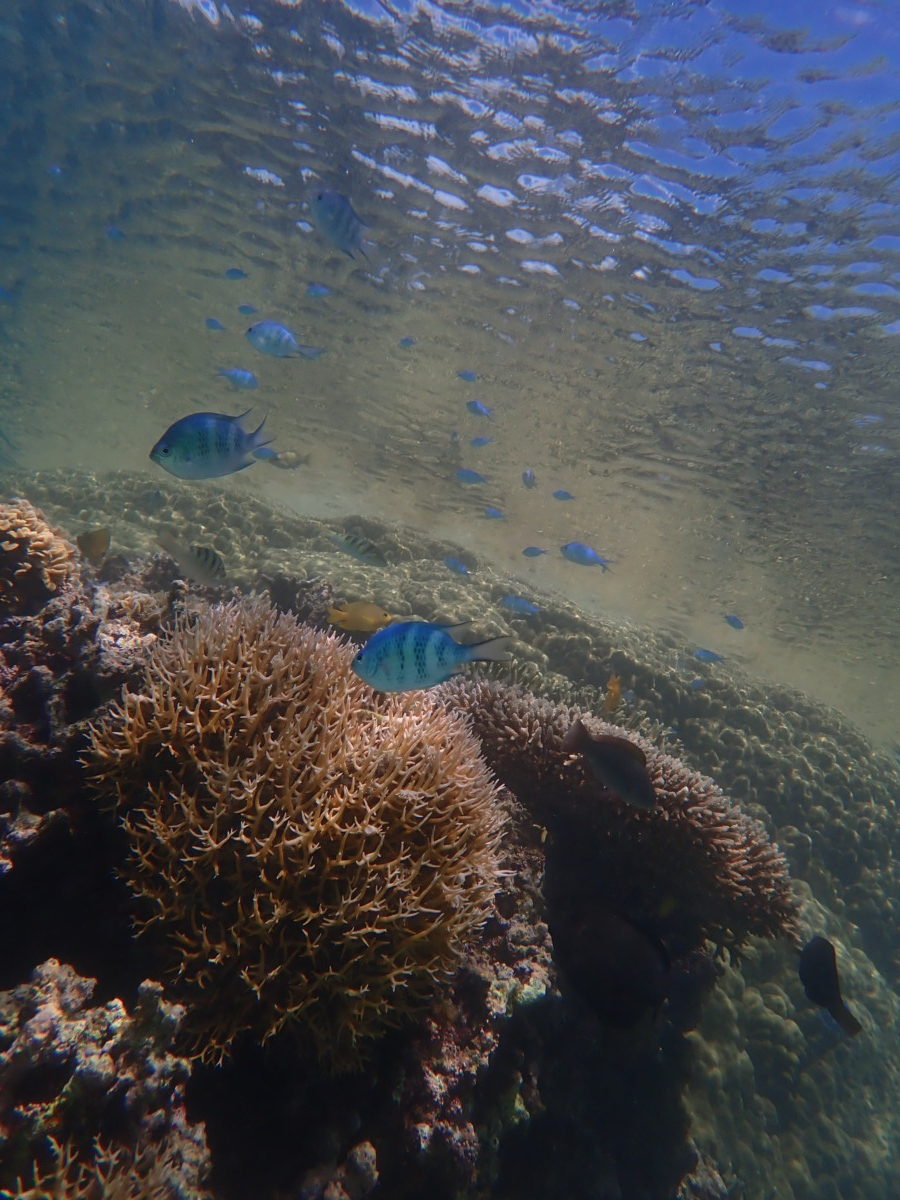 9/4の海 2021年9月4日 | コメントはまだありません 午後の海 9/4の海14:00 水温 31.6℃気温 32.5℃ 湿度 69% クラカオスズメダイ カガミチョウチョウウオ幼魚 手前 アオサンゴ デバスズメダイ 午後のみツアーへ中潮干潮の海は濁りのあるポイントもありました ハマサンゴの上を覗いたらヤエヤマギンポが目の前にいました 看板犬うめ 未分類
