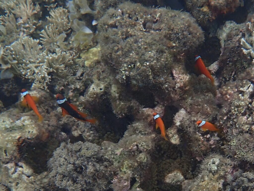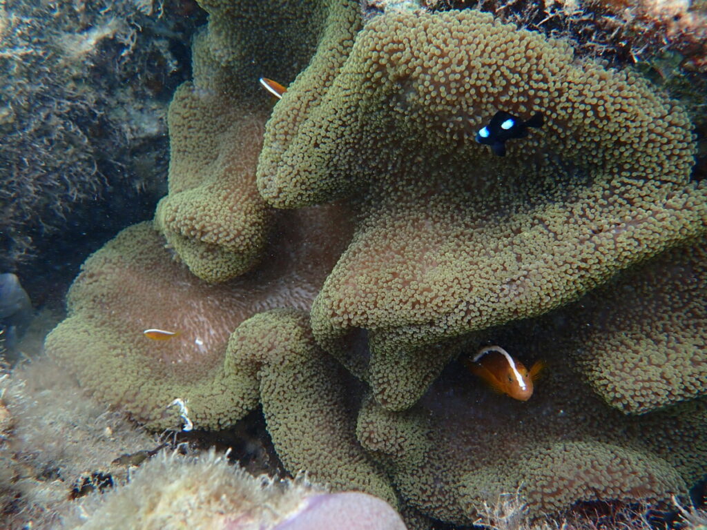 5/28の海 2024年5月28日 | コメントはまだありません ツアー開始時 ツアー前半 10:00 気温 29.2℃ 湿度 86% 水温 28.0℃ ツアー後半 風強めの予報だったためツアー前に海況チェック予報ほどの風ではなくツアー催行 セジロクマノミ お天気も曇り→薄曇り→少し晴れそしてツアー後土砂降りの雨今日も忙しい空模様 クマノミ団地 ユビエダハマサンゴ 時々降る大雨の影響もあり今日も海の中はスッキリせず でもサンゴやたくさんの魚を見て皆さん楽しそうにいっぱい泳いでいただけました うめとたまちゃんランちゃんみんな可愛い♡ 未分類