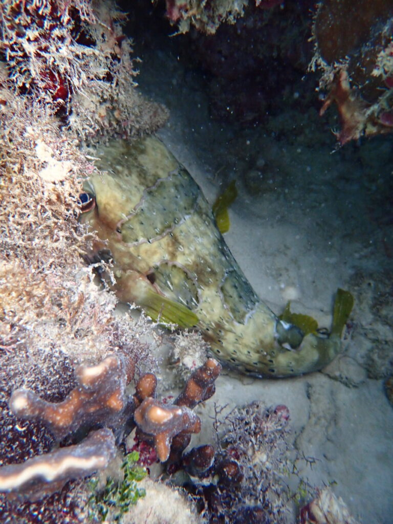 昨日、ハコフグ幼魚がいた穴を覗いたら