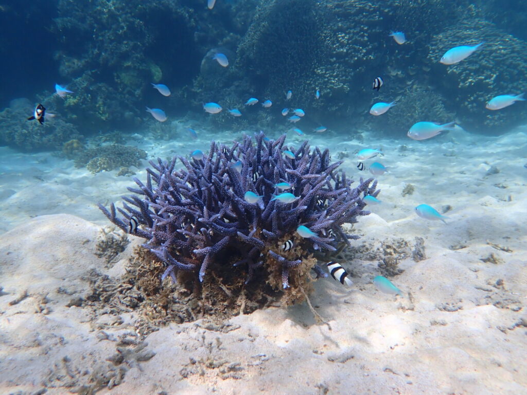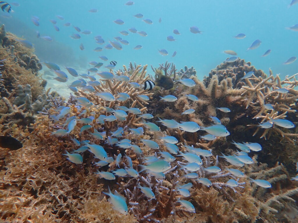 アオサンゴポイントでは、デバスズメダイがあちこちで群れていました