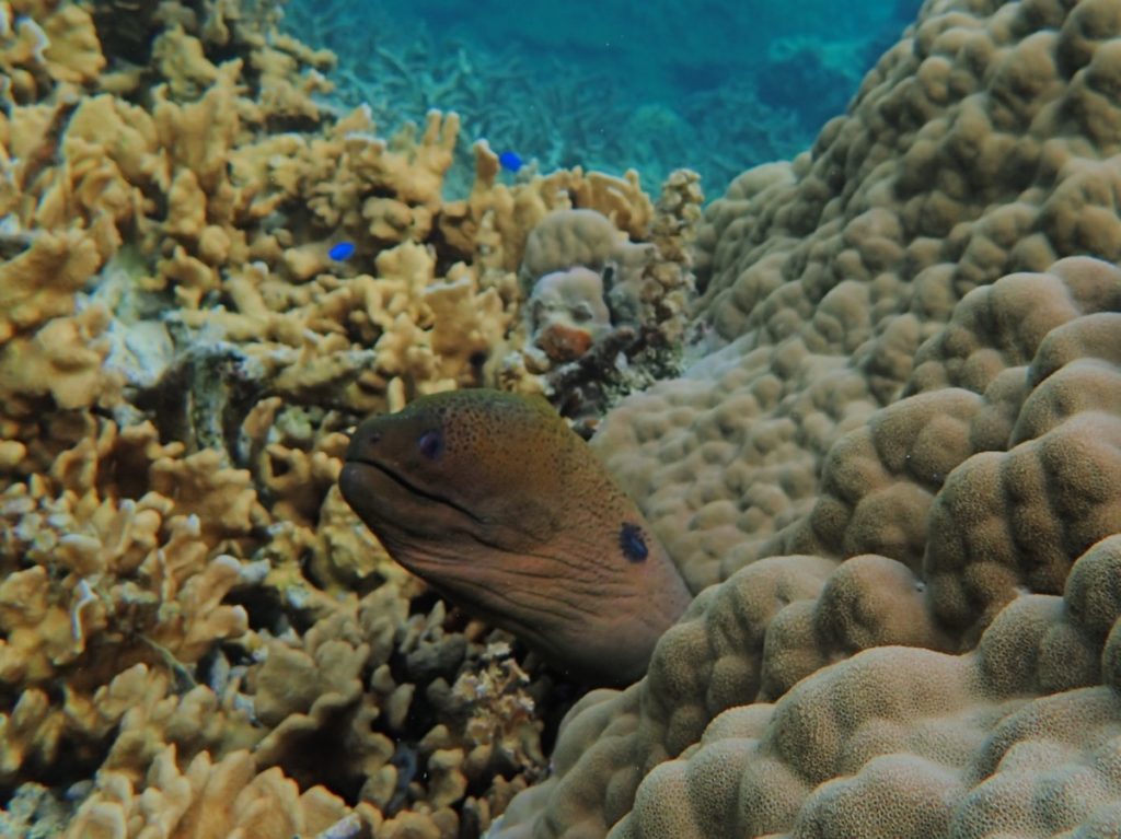 午後のみツアーへ! 2018年11月29日 | コメントはまだありません 午後の海 ツアー途中から晴れた白保海岸 気温 24.2℃ 湿度 60% 14:00 久しぶりに出会えたドクウツボ 名前に『ドク』 ってつくから 出会うと『ドキッ』 とする… でも、以外とかわいい顔(^^) コウイカの擬態 今日も居てくれたコウイカ 一瞬で体色を変える擬態には 毎回感動! イスズミ サザナミハギ近くで見ると繊細な模様がキレイ ハマサンゴとオヤユビウネタケハードコーラルとソフトコーラル 種類がわからない二枚貝 アオサンゴ ミナミハコフグ幼魚 ユビエダハマサンゴ デバスズメダイ 午後のお客様 うめは今日もお留守番犬 *11月〜3月のツアー* 満潮時のみ催行となります スケジュールはホームページにあります ご予約状況にてご確認下さい 冬の海も一緒に楽しみましょう! 未分類